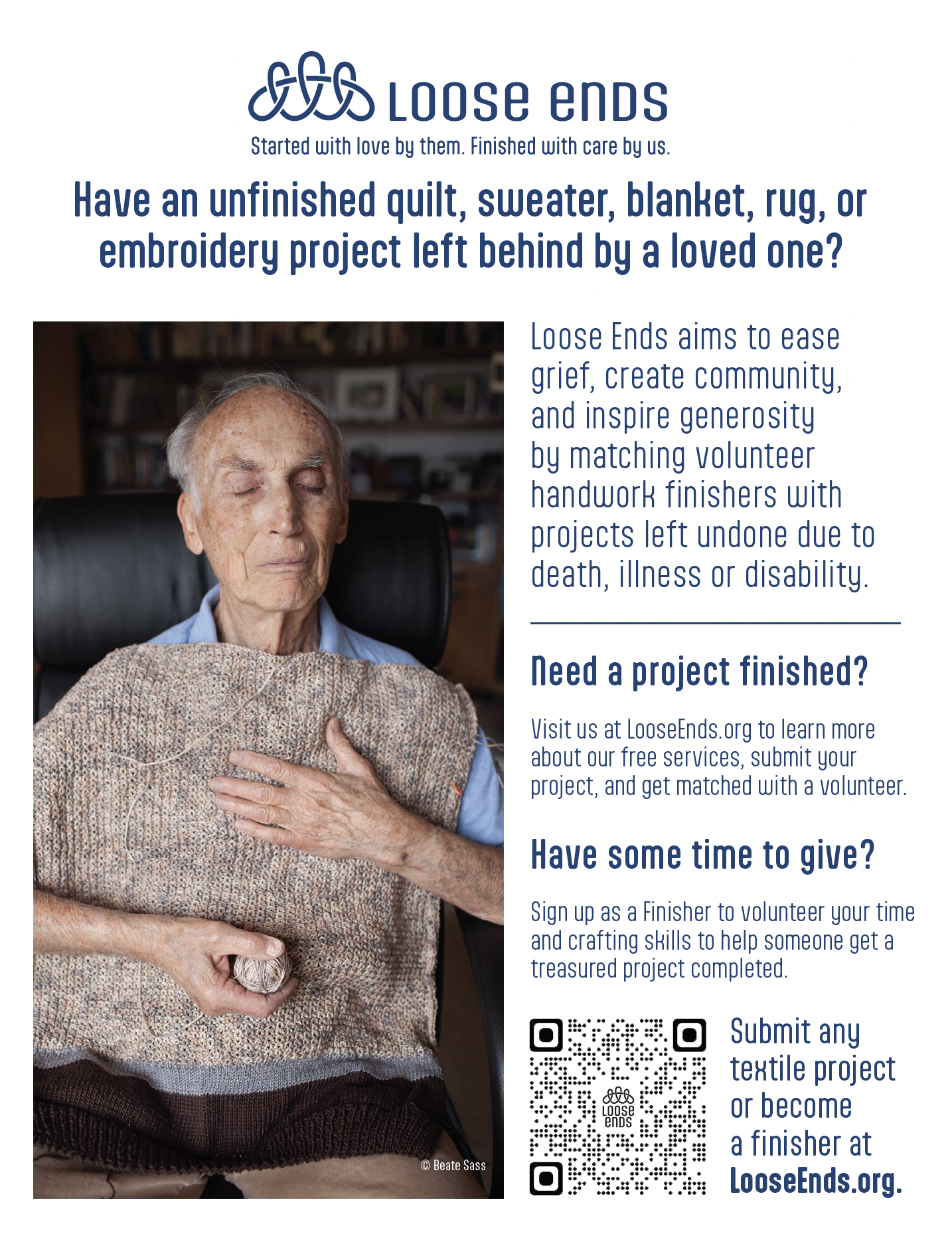 Loose Ends aims to ease grief, create community, and inspire generosity by matching volunteer handwork finishers with projects left undone due to death, illness, or disability.
