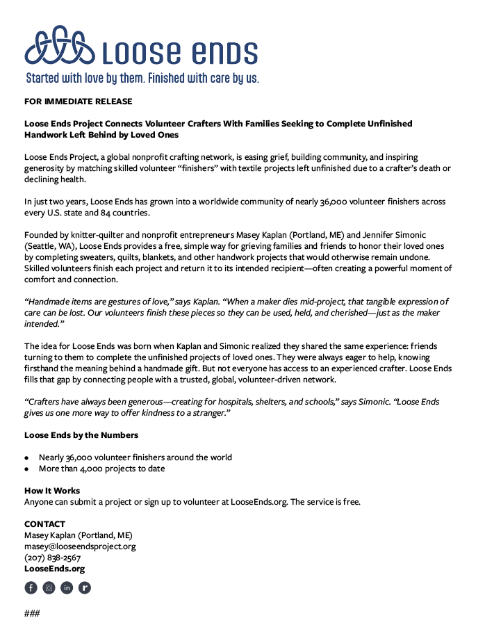 If you’d like to schedule an interview or call, contact Masey@LooseEndsProject.org