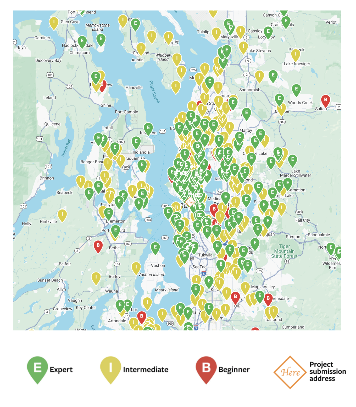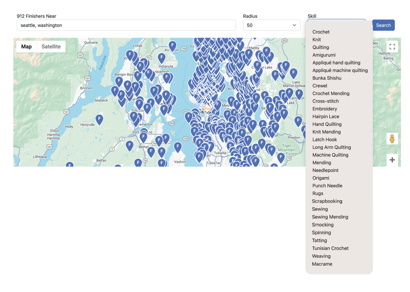 This is what it looks like when we enter “Seattle, WA” in the location field. All of the blue dots are finishers who have signed up as volunteers - 912 crafters total.